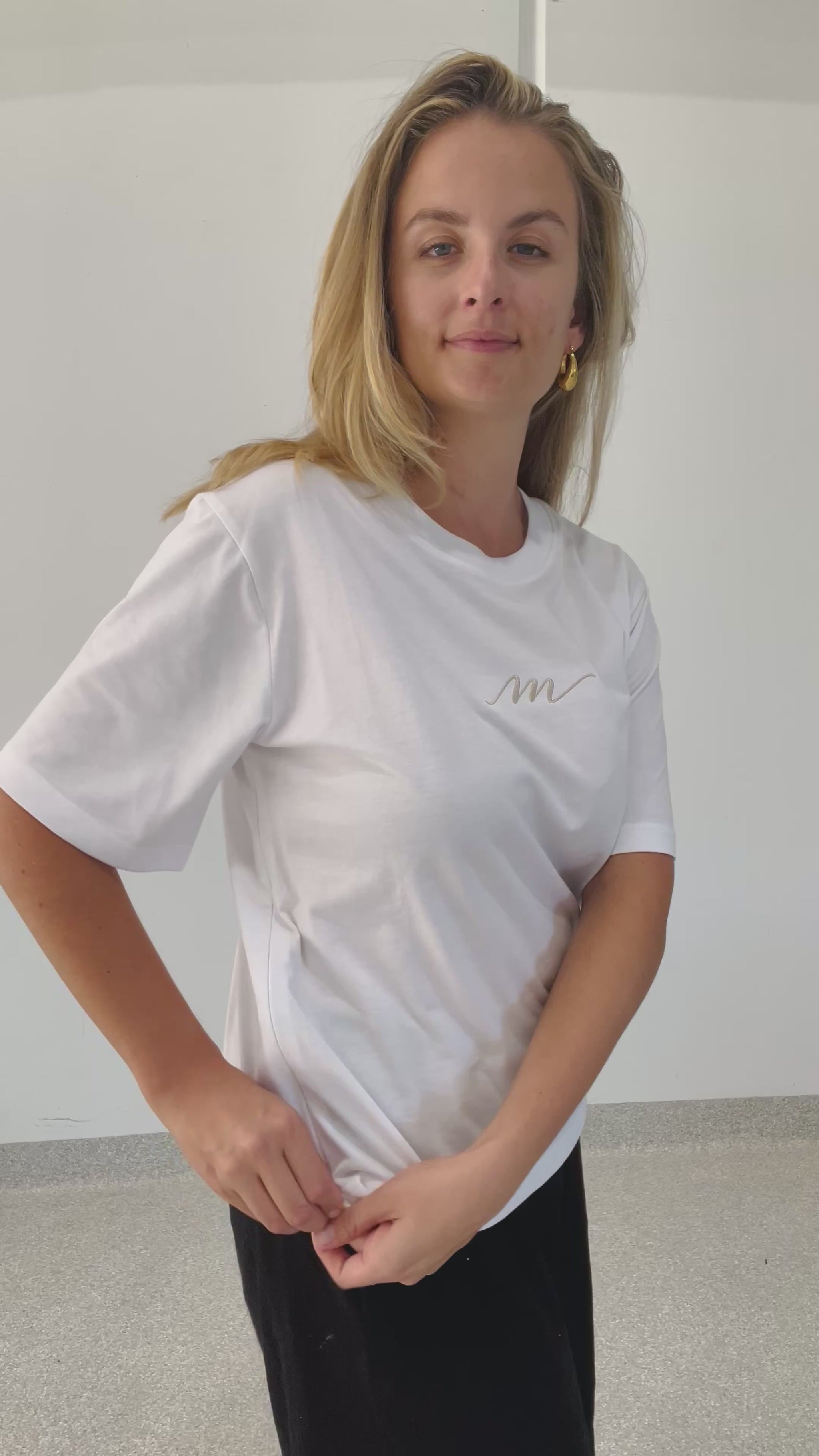 It's sized for a boxy true-to-size fit, draping effortlessly over your shape with room to breathe. From morning school runs to coffee catch-ups, workouts to wind-downs, this tee does it all - just like you! Emroidered with a beige signature mumsie m.Â